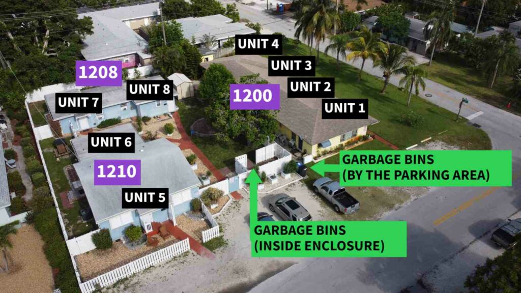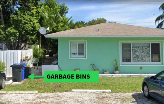 PICTURE ABOVE SHOWS THE GARBAGE BINS LOCATED NEAR THE PARKING AREA