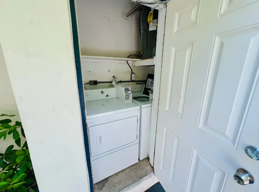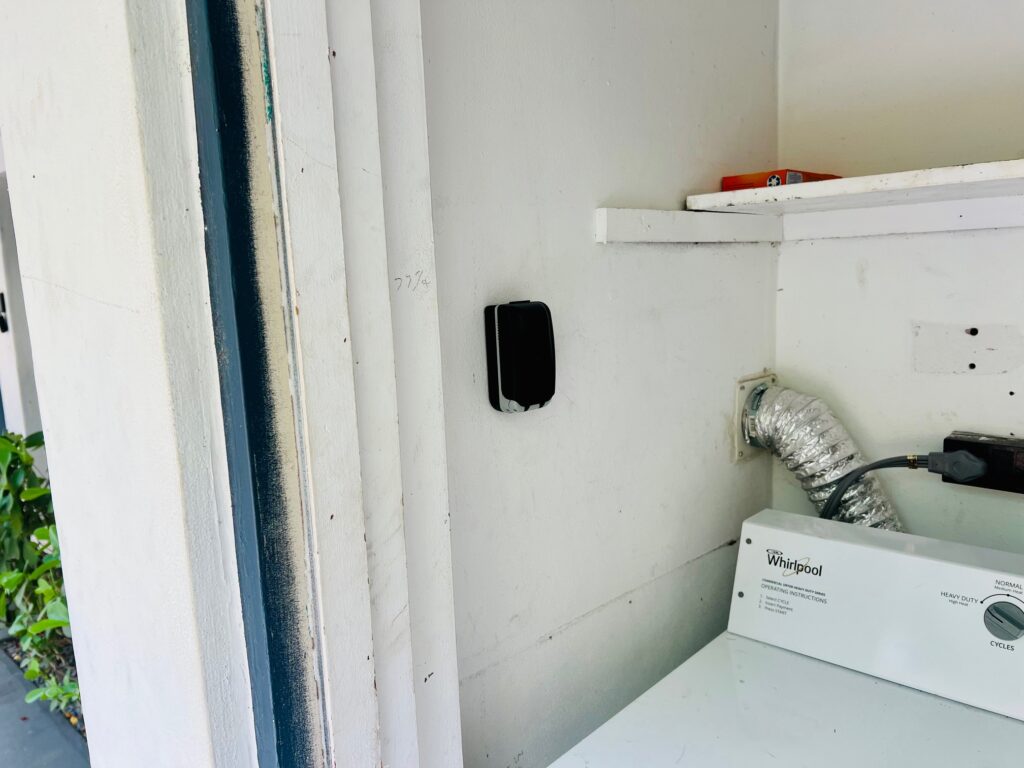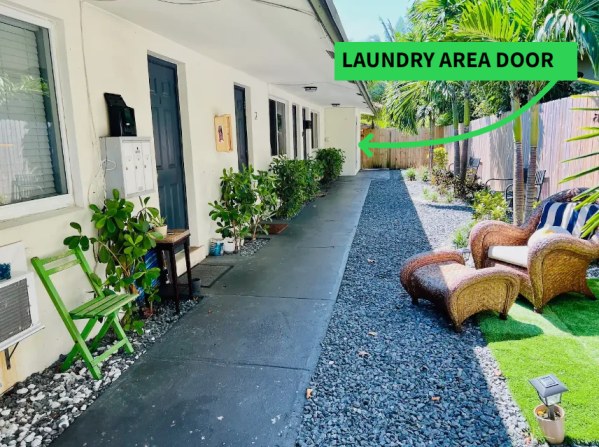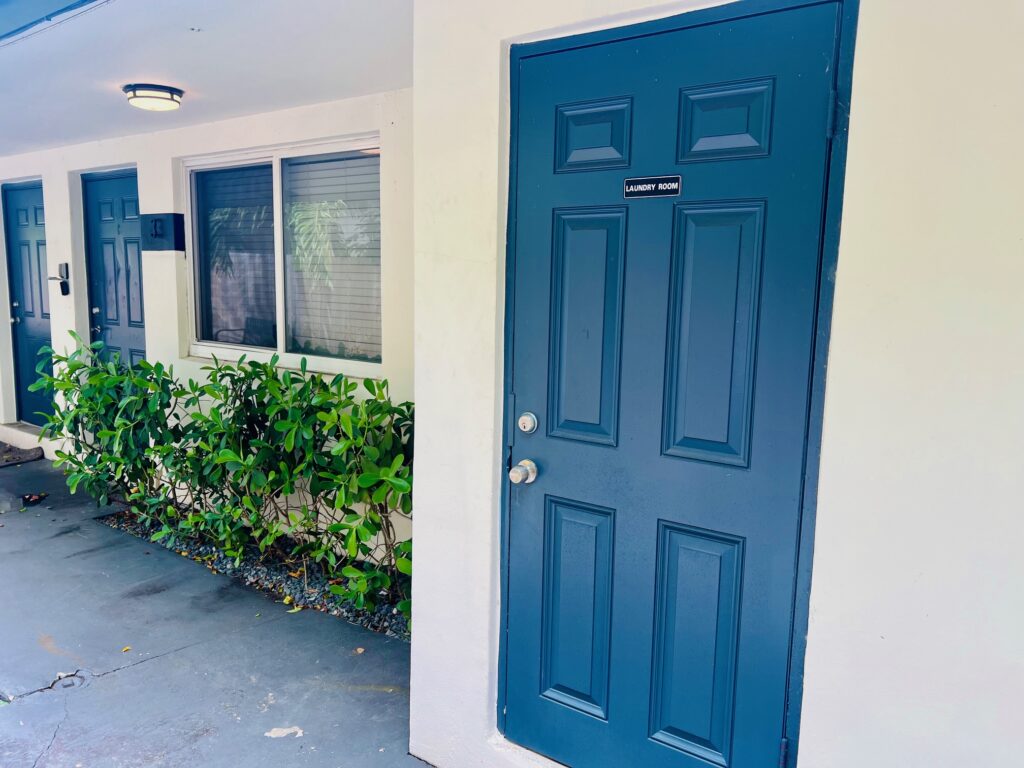 THE DOOR TO THE LAUNDRY AREA HAS THE WORDS “LAUNDRY ROOM” ON IT.